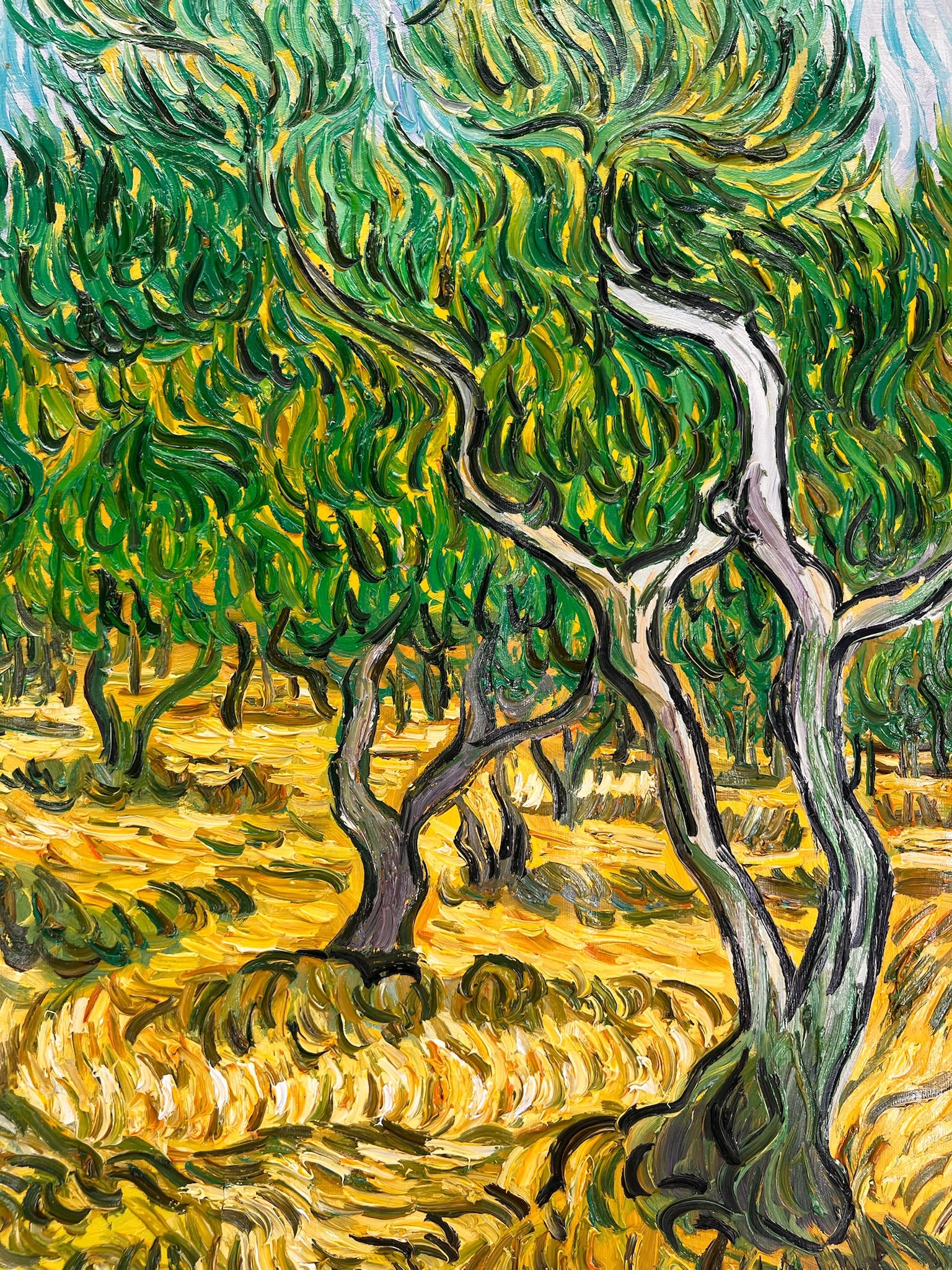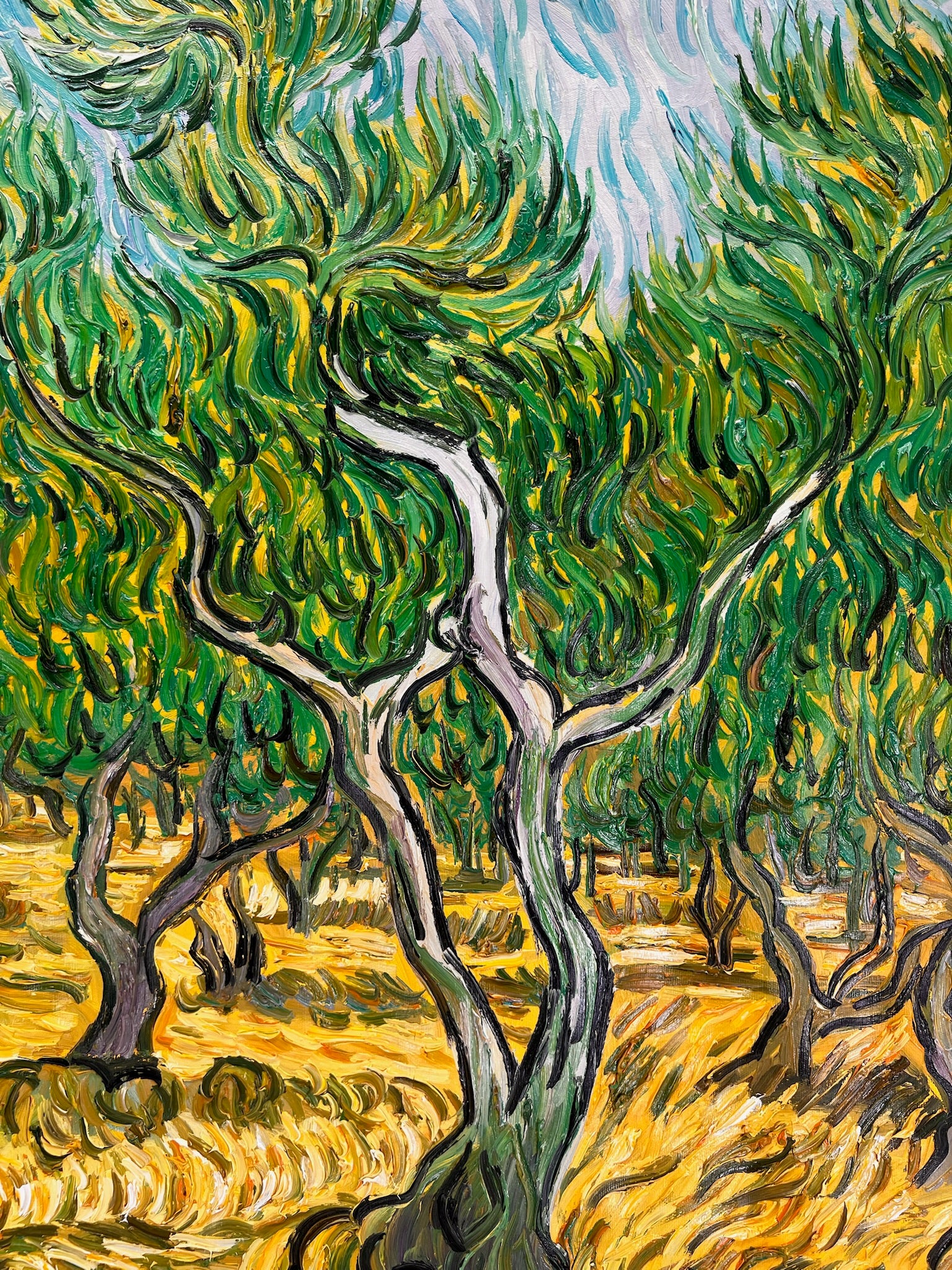 Questa vivace interpretazione dipinta a mano di Ulivi cattura l'energia intensa e il tocco emotivo che caratterizzano l'eredità post-impressionista di Vincent van Gogh. Il dipinto originale, realizzato nel 1889 durante il suo soggiorno nell'ospedale psichiatrico di Saint-Rémy-de-Provence, riflette la fascinazione di Van Gogh per la natura e il suo profondo legame con il paesaggio circostante.