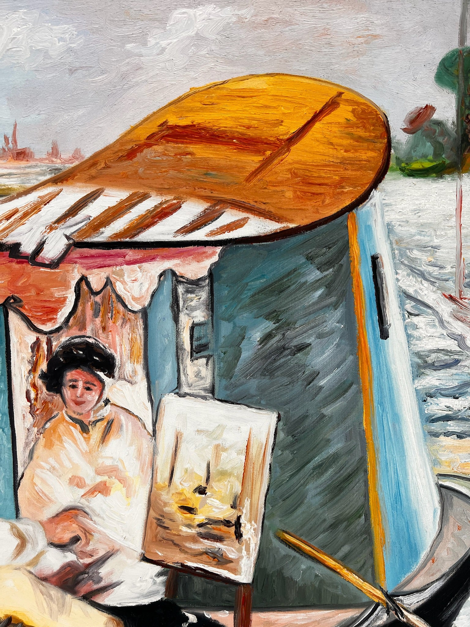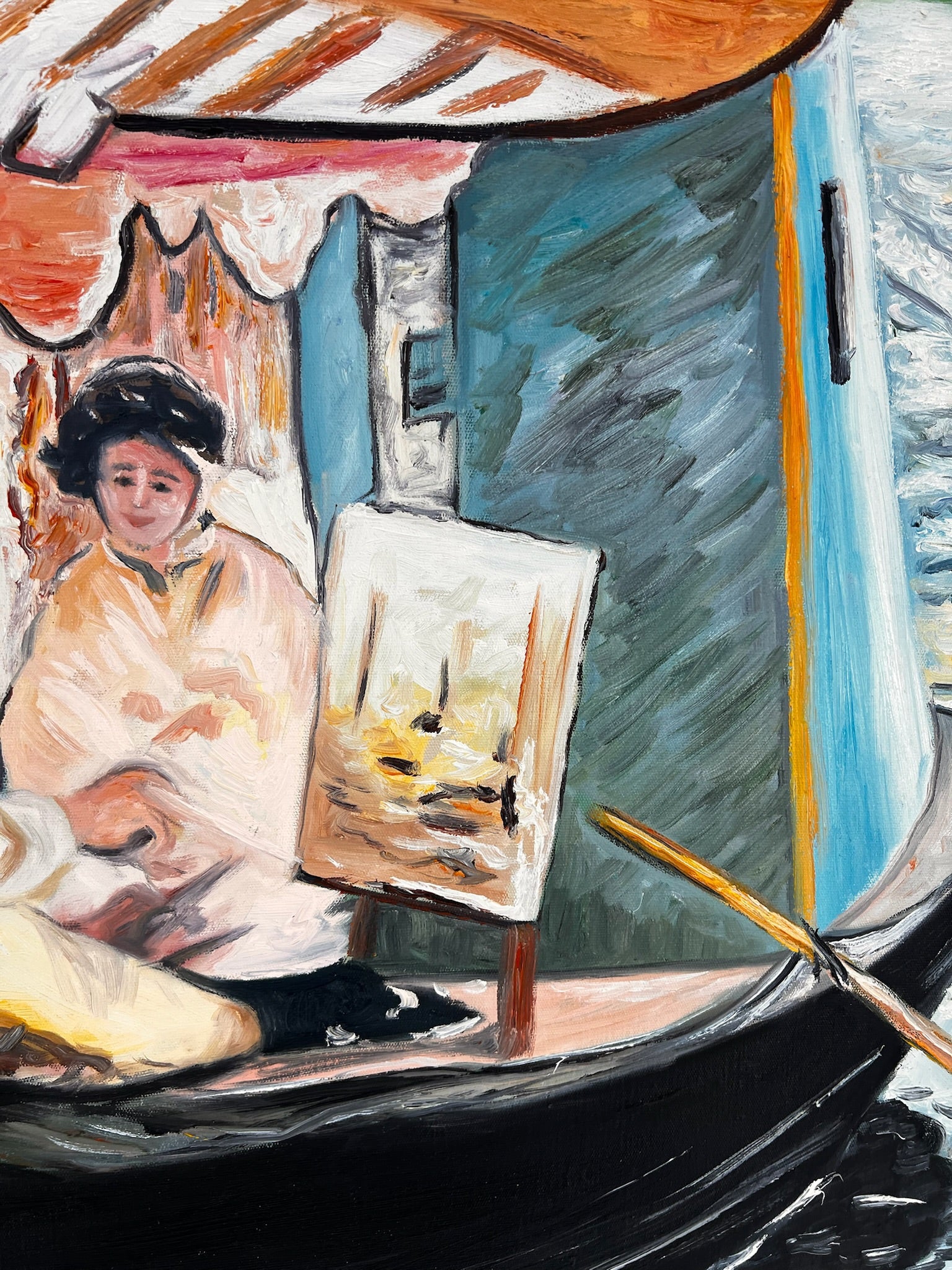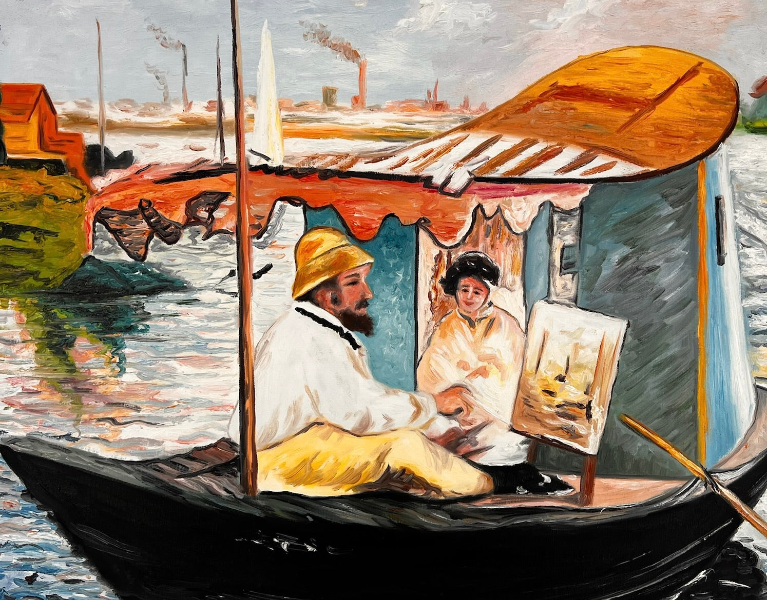 Questo dipinto è una replica dipinta a mano di Le Déjeuner sur l’Herbe, in cui Claude Monet ha espresso il suo stile impressionista. La scena mostra un pittore e il suo modello in una barca, immersi in un gioco di luce e riflessi. Le pennellate sciolte, i colori freschi e la composizione vivace rendono quest'opera un esempio dell'approccio impressionista: catturare la natura e il momento nella sua spontaneità.