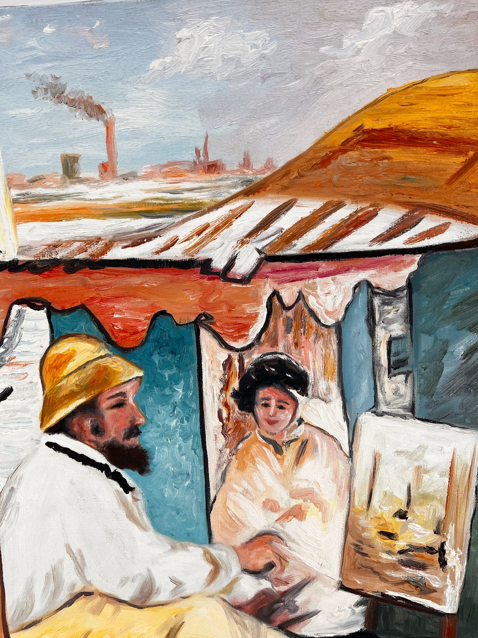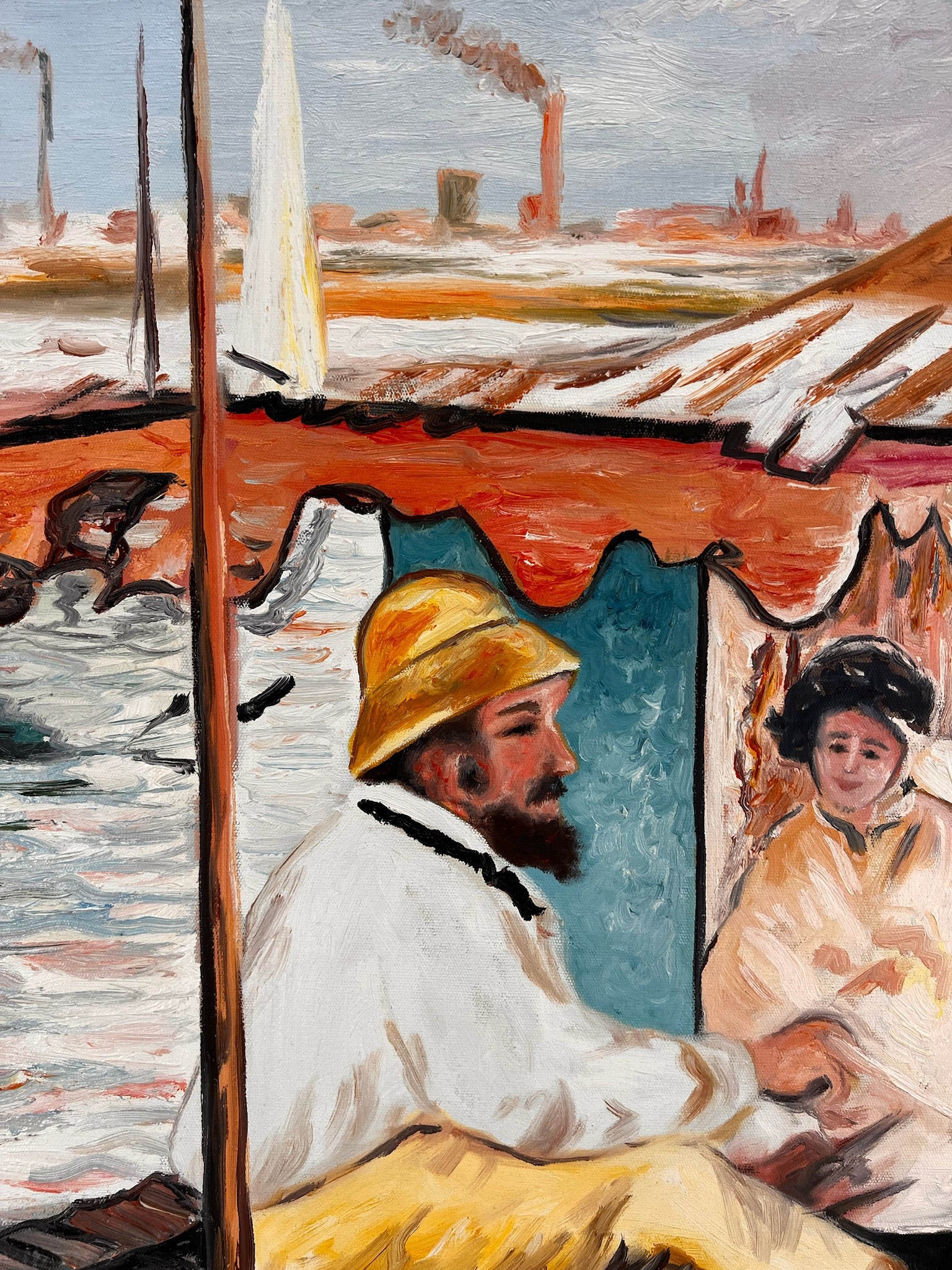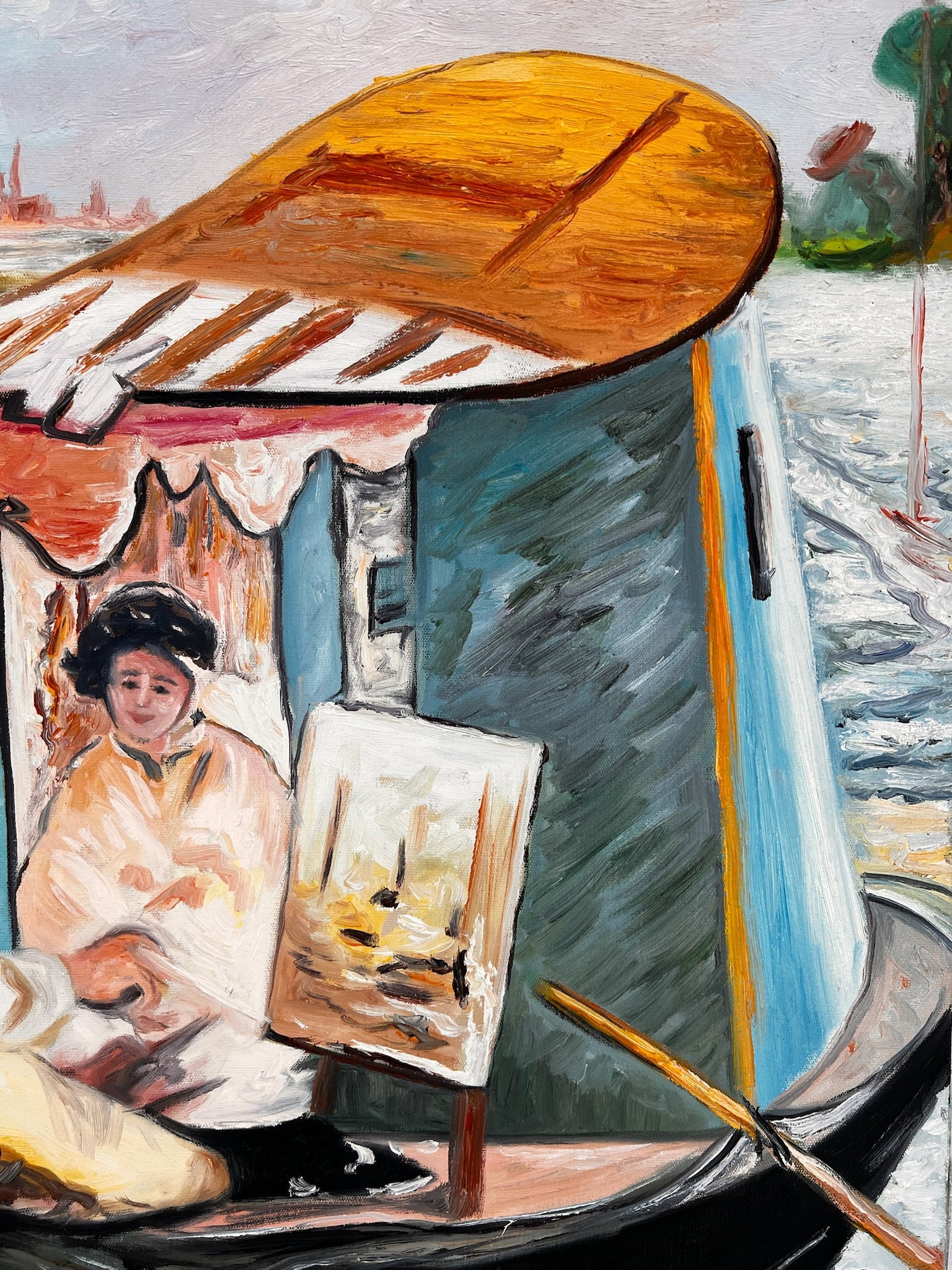 Questo dipinto è una replica dipinta a mano di Le Déjeuner sur l’Herbe, in cui Claude Monet ha espresso il suo stile impressionista. La scena mostra un pittore e il suo modello in una barca, immersi in un gioco di luce e riflessi. Le pennellate sciolte, i colori freschi e la composizione vivace rendono quest'opera un esempio dell'approccio impressionista: catturare la natura e il momento nella sua spontaneità.