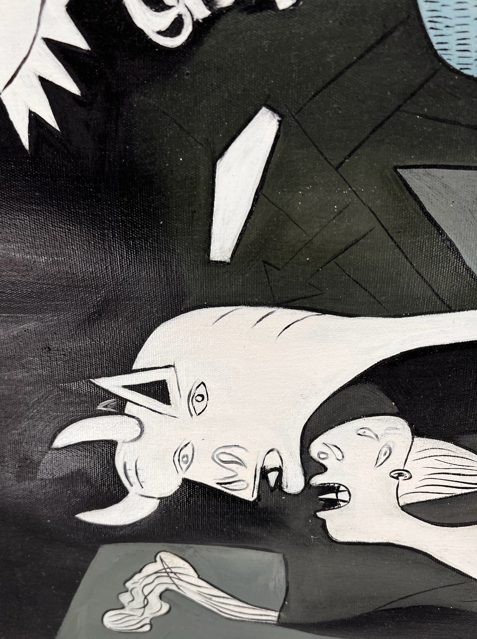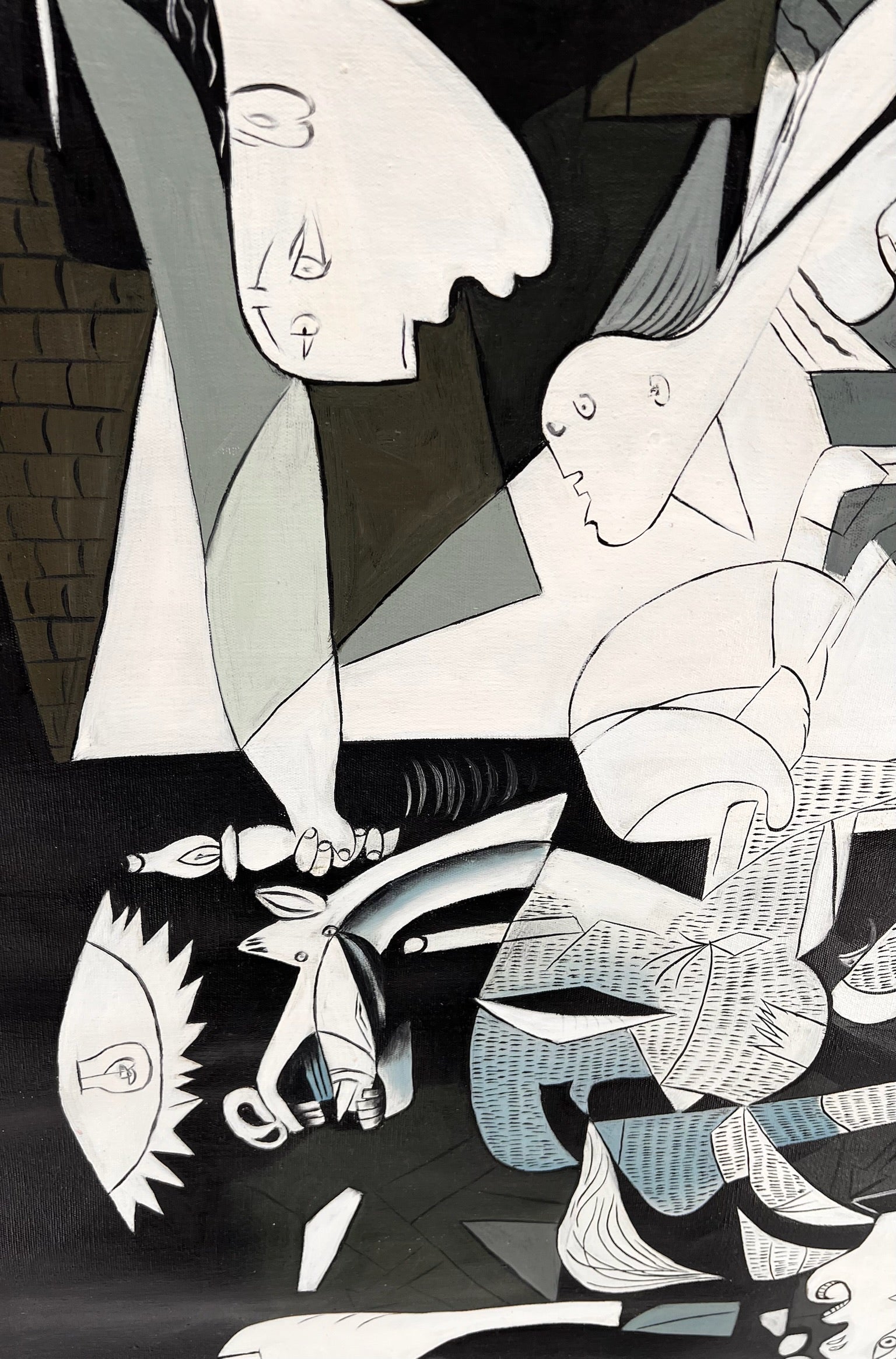 Quest'opera è ispirata al famoso Guernica di Picasso (1937), una delle più potenti denunce della guerra nella storia dell'arte. Il dipinto è stato realizzato in risposta al bombardamento del villaggio basco di Guernica durante la guerra civile spagnola.
