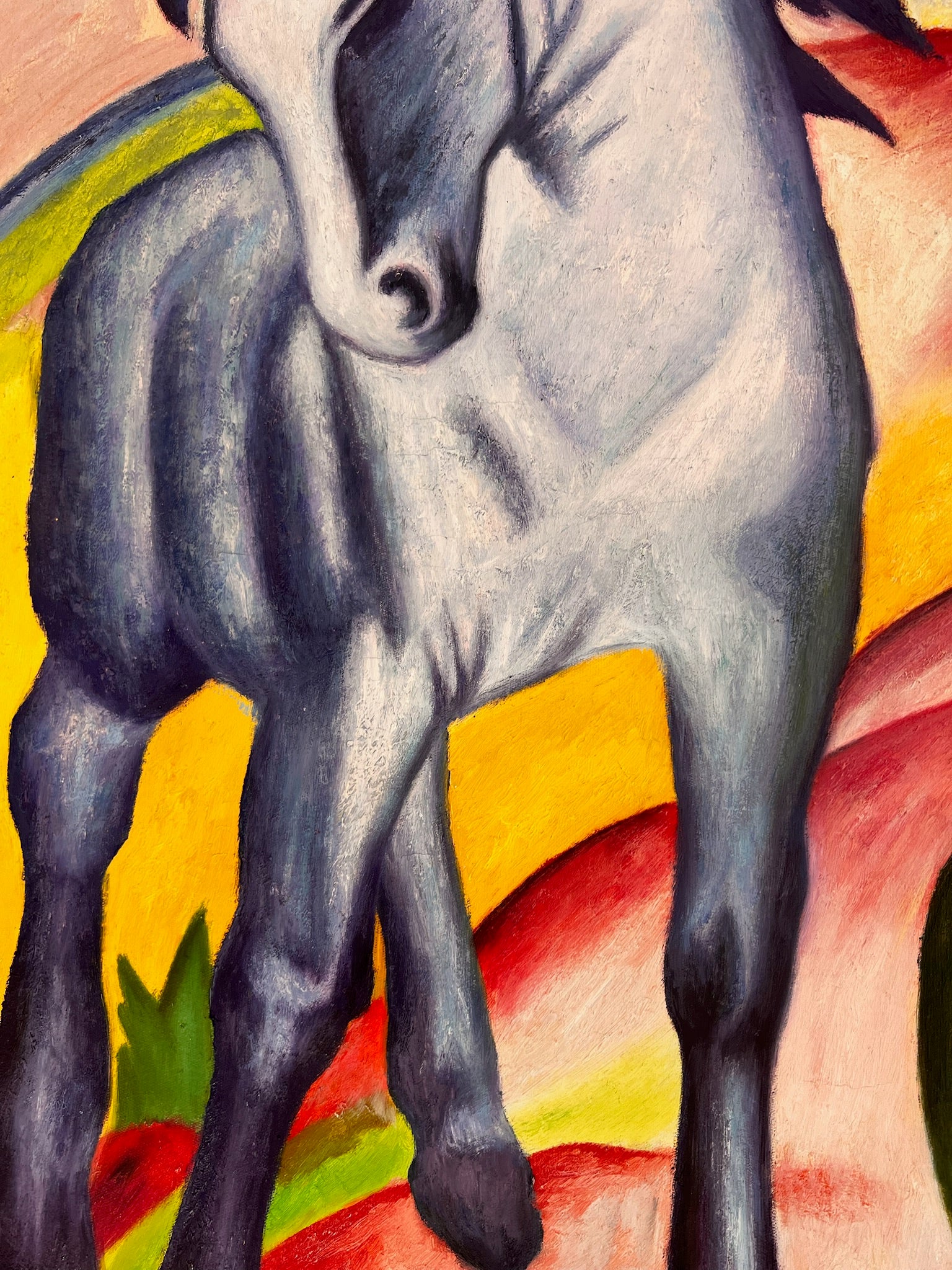 Questo dipinto è una replica dipinta a mano di Cavallo Blu I (1911), una delle opere più iconiche di Franz Marc. Mostra una rappresentazione espressiva di un cavallo blu, sdraiato in un ambiente colorato. Marc ha scelto deliberatamente il blu come simbolo di spiritualità e purezza interiore, in contrapposizione alla simbologia terrena e materiale di altri colori.