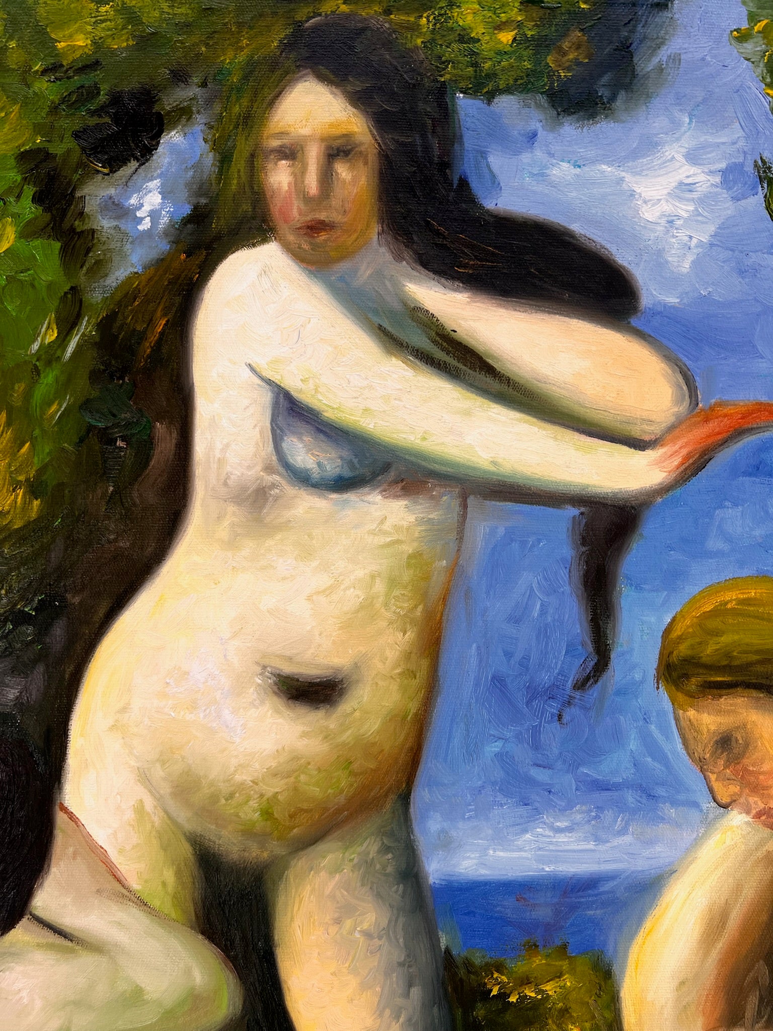 Questa splendida tela dipinta a mano è ispirata alla famosa serie di Cézanne Bagnanti, che rappresenta gruppi di donne che si bagnano in un ambiente naturale. Il dipinto mostra tre nudi, rappresentati con pennellate forti e tonalità terrose che contrastano con il cielo blu brillante e la vegetazione verde.
