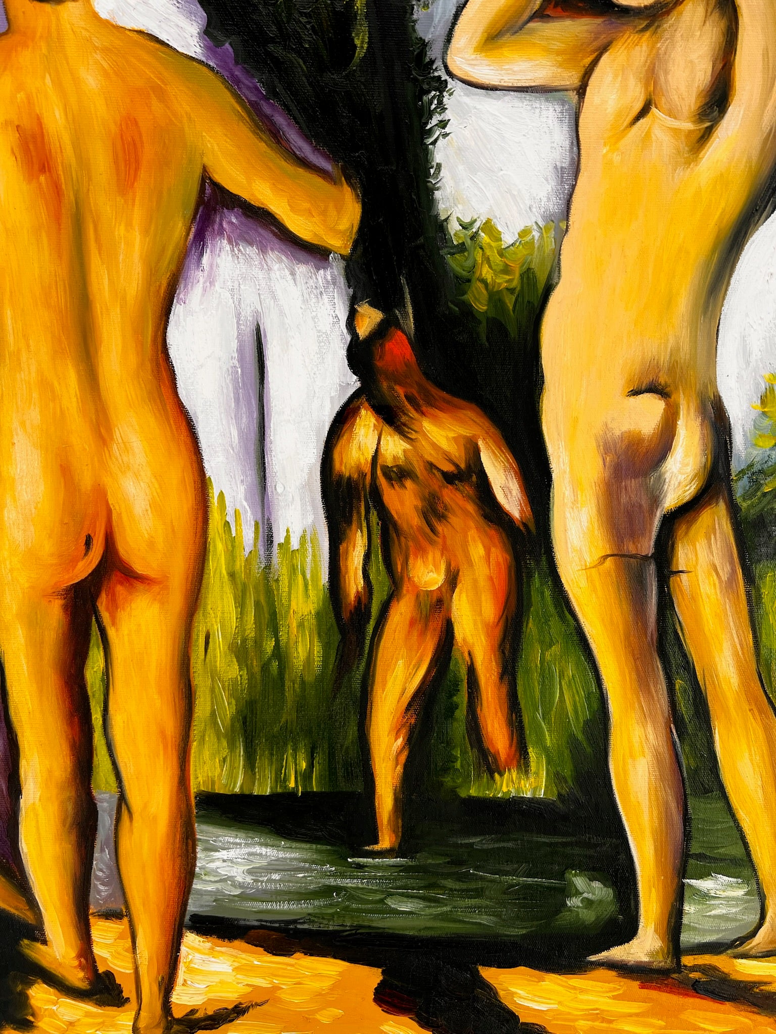 Les Grandes Baigneuses (5 Figure) – Dipinto a olio post-impressionista su tela dipinta a mano (164 × 80 cm)