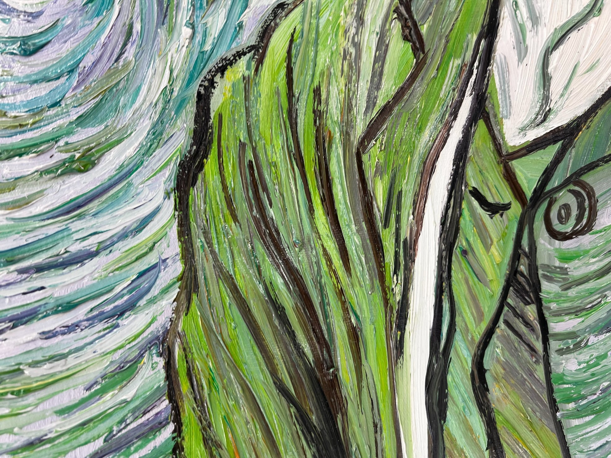 Lo sfondo ondulato e lo sguardo penetrante riflettono sia le lotte interiori di Van Gogh che il suo talento incomparabile. Questo dipinto è un'opera impressionante per ogni collezionista o ammiratore di Van Gogh, e trasmette una texture audace, colori vivaci e un profondo senso di personalità e presenza.
