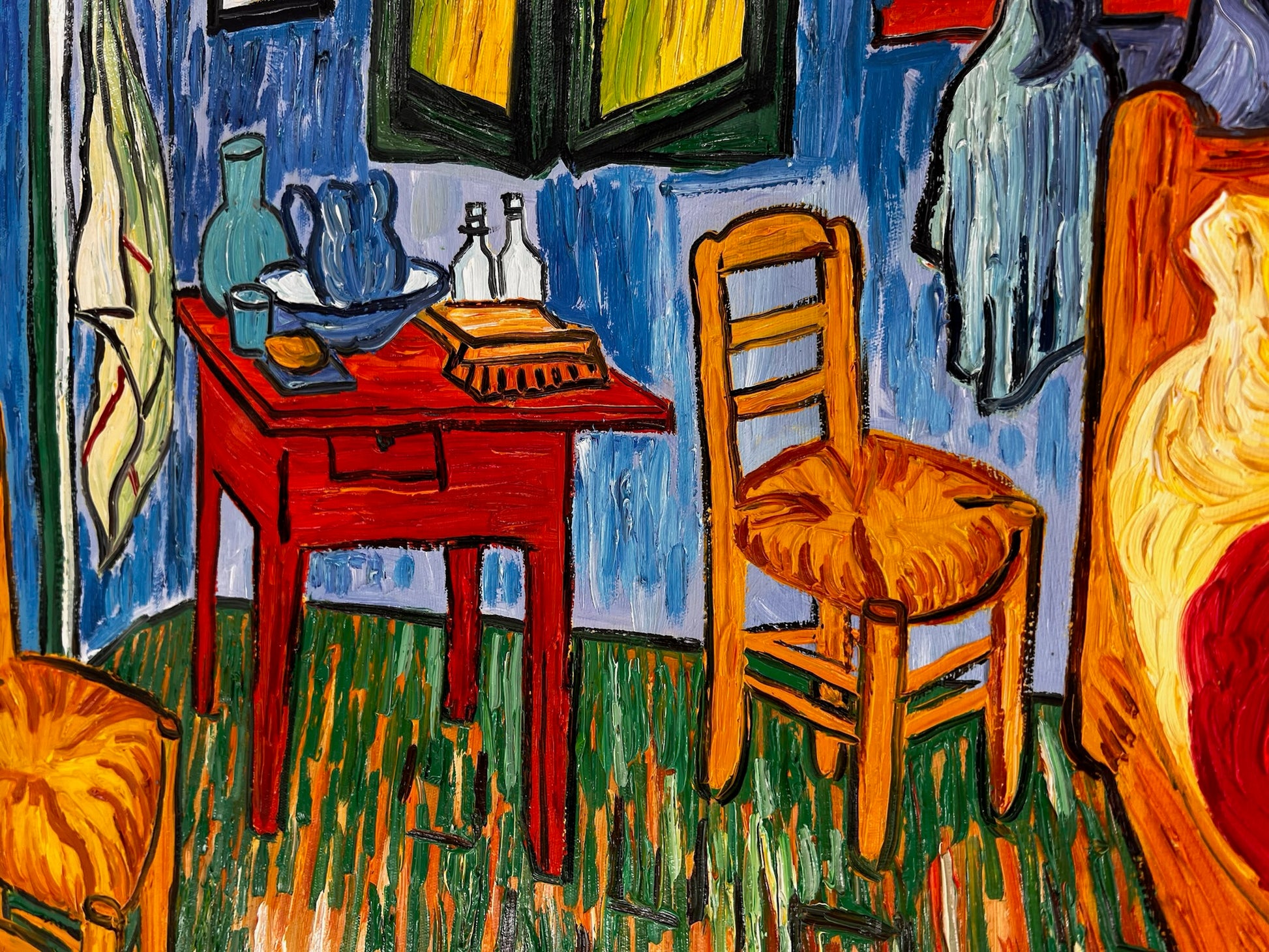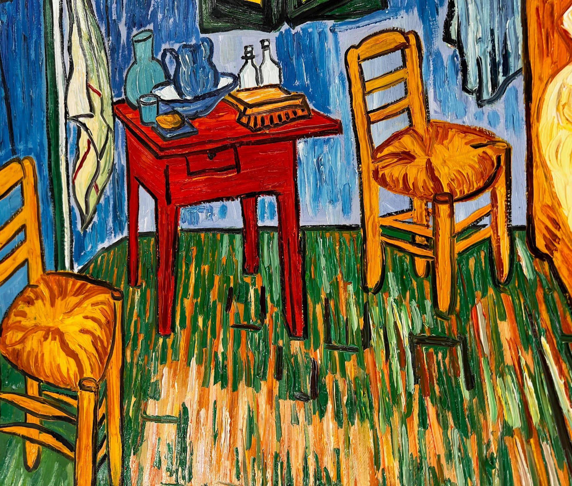 Questa espressiva opera d'arte dipinta a mano è una reinterpretazione del famoso La Camera di Vincent van Gogh, dipinta ad Arles nel 1888. L'opera mostra la camera dell'artista stesso in colori audaci e vivaci, con i suoi caratteristici colpi di pennello, che trasformano un interno semplice in un dipinto pieno di intensità emotiva e calore.